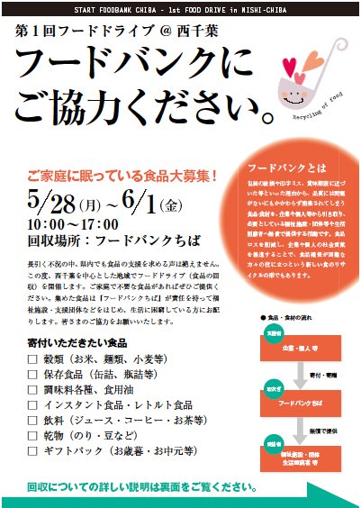 西千葉でフードドライブを行います!! フードドライブ 2012年05月18日 フードドライブ@西千葉チラシ(PDF) 5/28~6/1に西千葉で家庭等で余っている食材を集める「フードドライブ」を開 催します。 毎日、まだ食べられるのに大量の食品が廃棄されています。一方で、日本の相対 的貧困率は16%と発表され、6~7人に1人ンは貧困ライン以下の生 活をしていま す。生活保護受給者は年々増大し、千葉市では約55人に1人が保護を受給してい ます。 今月活動を開始した「フードバンクちば」は、余っている食品と困っている人を つなぐ活動です。 このたび、5月28日(月)~6月1日(金)の期間、千葉市の西千葉駅周辺地域 で、家庭等で余っている食品・食材などをご提供いただく「フードド ライブ」 活動を行います。 ご寄付いただいた食品は、福祉団体や施設、困窮している個人等に無償で提供し ます。 ぜひ、近隣の方や通勤・通学等で西千葉近辺を通る方、下記の事務所まで余って いる食品をお持ちいただけると嬉しいです。 寄付いただきたい食品 □ 穀類(お米、麺類、小麦等) □ 保存食品(缶詰、瓶詰等) □ 調味料各種、食用油 □ インスタント食品・レトルト食品 □ 飲料(ジュース・コーヒー・お茶等) □ 乾物(のり・豆など) □ ギフトパック(お歳暮・お中元等) 注意いただきたい点 ❶ 賞味期限が明記されているもの ❷ 賞味期限が3ヶ月以上あるもの ❸ 未開封であるもの ❹ 破損で中身が出ていないもの ❺ お米は常識の範囲内で古くないもの <お問い合わせ先> フードバンクちば (ワーカーズコープちば 企業組合労協船橋事業団 サポートセンターオアシス内) 〒263-0023 千葉市稲毛区緑町1-25-11コーポ立花101 TEL 043-375-6804 (平日10:00~17:00) FAX 043-242-8900 MAIL fbchiba@jigyoudan.com ※スタッフ不在の場合は、留守番電話にお名前とご連絡先電話番号をお話しください。折り返しこちらからご連絡いたします。 フードバンクちば 食品ロス 貧困問題 食料支援 生活困窮者支援[0回]