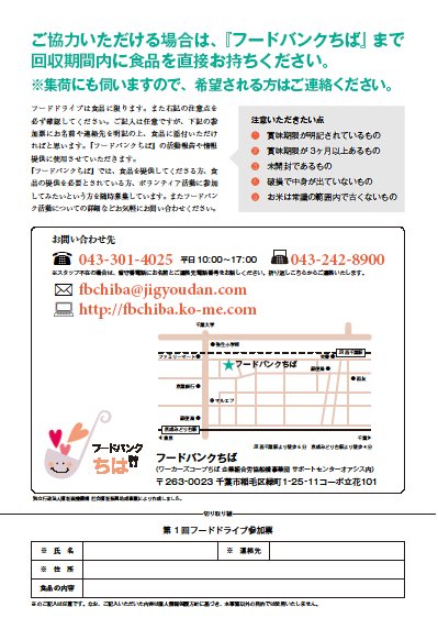 第2回フードドライブを開催します フードドライブ 2012年09月28日 「フードドライブ」とは、ご家庭で余っている食品をご寄贈いただき、福祉施設や団体、困窮する個人等に無償で提供するボランティア活動です。 ◆主催:フードバンクちば ◆期間:9月10日(月)~9月28日(金) ◆受付:平日9:00~17:00 ◆ご寄付いただきたい食品 お米、パスタ 、乾物(のり・豆など)、保存食品(缶詰、瓶詰等)、フリーズドライ食品 、インスタント食品、レトルト食品 、ギフトパック(贈答品の余剰等) 、調味料各種、食用油 、飲料(ジュース、コーヒー、紅茶等)など ※常温で保存可能で、賞味期限が1ヶ月以上あるもの ◆集荷場所 ※以下の場所で食品を受け付けております↓ ↓ フードバンクちば事務所 千葉市稲毛区緑町1-25-11コーポ立花101 TEL.043-375-6804 社会福祉法人千葉市社会福祉協議会 中央区事務所 http://www.chiba-shakyo.com/chuo/ 千葉市中央区中央4-5-1(Qiball きぼーる11 階) 稲毛区事務所 http://www.chiba-shakyo.com/inage/ 千葉市稲毛区穴川4-12-4(稲毛保健福祉センター3 階) 美浜区事務所 http://www.chiba-shakyo.com/mihama/ 千葉市美浜区真砂5-15-2(美浜保健福祉センター2 階) 花見川区事務所 http://www.chiba-shakyo.com/hanamigawa/ 千葉市花見川区瑞穂1-1(花見川保健福祉センター3 階) 若葉区事務所 http://www.chiba-shakyo.com/wakaba/ 千葉市若葉区貝塚2-19-1(若葉保健福祉センター4 階) 緑区事務所 http://www.chiba-shakyo.com/midori/ 千葉市緑区鎌取町226-1(緑保健福祉センター2 階) (社)千葉県労働者福祉協議会 http://www.rfk-chiba.net/ 千葉市中央区千葉港4-4 千葉県労働者福祉センター内 NPO 法人カフェ・バルコニーの家 http://www.cafe-balcony.jp/ 千葉市美浜区磯辺3-5-7 ワーカーズコープちば http://jigyoudan.com/ 船橋市高根台6-1-12 TEL.047-467-4920 白井地域福祉事業所しいの木 白井市根1971-1 ◆送付先:フードバンクちば (〒263-0023 千葉市稲毛区緑町1-25-11コーポ立花101) ※送料は自己負担でお願いします。 ◆お問合わせ:フードバンクちば TEL.043-375-6804 フードバンクちば 食品ロス 貧困問題 食料支援 生活困窮者支援[0回]