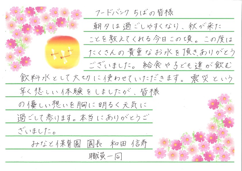 福島の保育園からお礼状をいただきました 活動報告 2012年09月11日 先日、お水をお届けした福島市のみなと保育園より、すてきなお礼状をいただきました。 ありがとうございました。 フードバンクちば 食品ロス 貧困問題 食料支援 生活困窮者支援[0回]PR