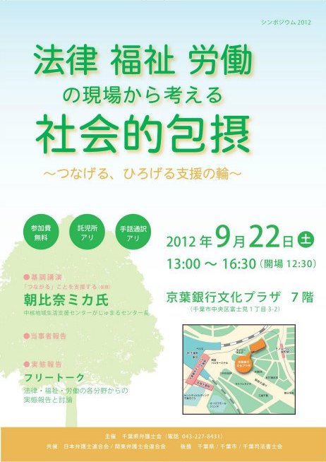 弁護士会シンポジウムに参加します ご案内 2012年09月14日 反貧困全国キャラバンin千葉の最後のまとめとして千葉県弁護士会のシンポジウムが開催されます。フードバンクちば(ワーカーズコープちば)も実態報告に参加します。 シンポジウム 「法律 福祉 労働の現場から考える社会的包摂 ~つながる、ひろげる支援の輪~」 日 時:2012年9月22日(土)13:00~16:30(開場12:30) 会 場:京葉銀行文化プラザ7階(千葉市中央区富士見1-3-2) 基調講演:「つながる」ことを支援する(仮題) 朝比奈ミカ氏(中核地域生活支援センターがじゅまるセンター長) 当事者報告: 実態報告:フリートーク 法律・福祉・労働の各分野からの実態報告と討論 参加費:無料、手話通訳あり、託児所あり 主 催:千葉県弁護士会 共 催:日本弁護士連合会/関東弁護士連合会 後 援:千葉県/千葉市/千葉司法書士会 終了後、パレードがあります。 16:30~18:00 パレード 「真面目に働いても貧困って何故だ? この国に格差なんて要らないぞ! 格差社会を是正しろ!」 フードバンクちば 食品ロス 貧困問題 食料支援 生活困窮者支援[0回]PR
