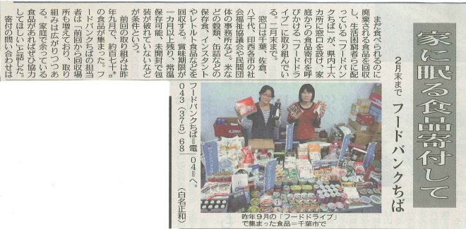 まだ食べられるのに廃棄される食品を回収し、生活困窮者らに配っている「フードバンクちば」が、県内十六カ所に窓口を設け、家庭からの食品寄付を呼びかける「フードドライブ」に取り組んでいる。二月末まで。